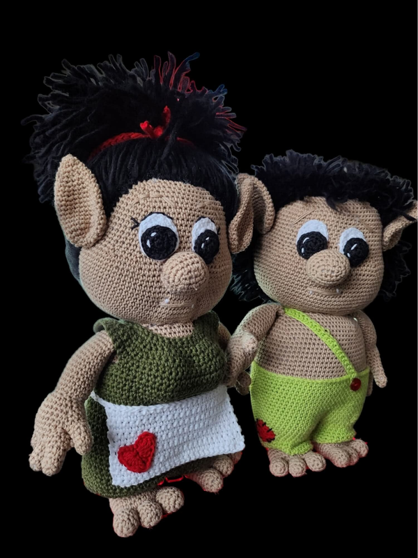 Sødt Troldepar, som er hæklet i lækkert bomuldsgarn. Og kan laves i ønskede farver.