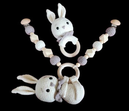 Sødt sæt bestående af barnevognskæde og rangle med kanin, hæklet i lækker blød bomuld, og kan laves i ønskede farver.