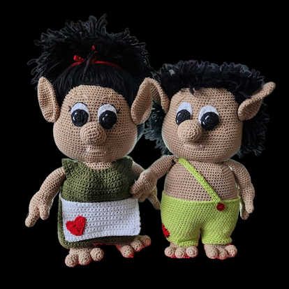 Sødt Troldepar, som er hæklet i lækkert bomuldsgarn. Og kan laves i ønskede farver.